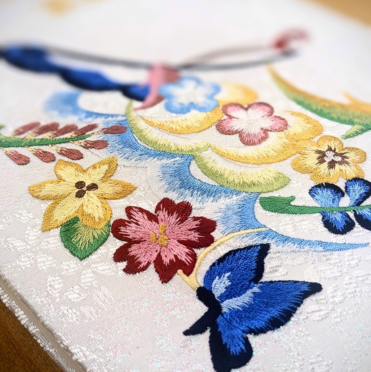 法泉寺御首題帳の特徴は、数十色の光沢のある刺繍糸を使い、何度も重ねる事によって表現できる細かなグラデーション刺繍、開運花文字デザインは、一つ一つの動植物は全て吉祥の縁起物であり、一つ一つ意味があります。そして皆様の安穏を祈願し御守りとなるよう住職が御祈祷を行い、祈祷の証明と願主として皆様のお名前の記載を書き入れる、こだわりの詰まった、必ずご満足頂ける帳面をお作りしております。