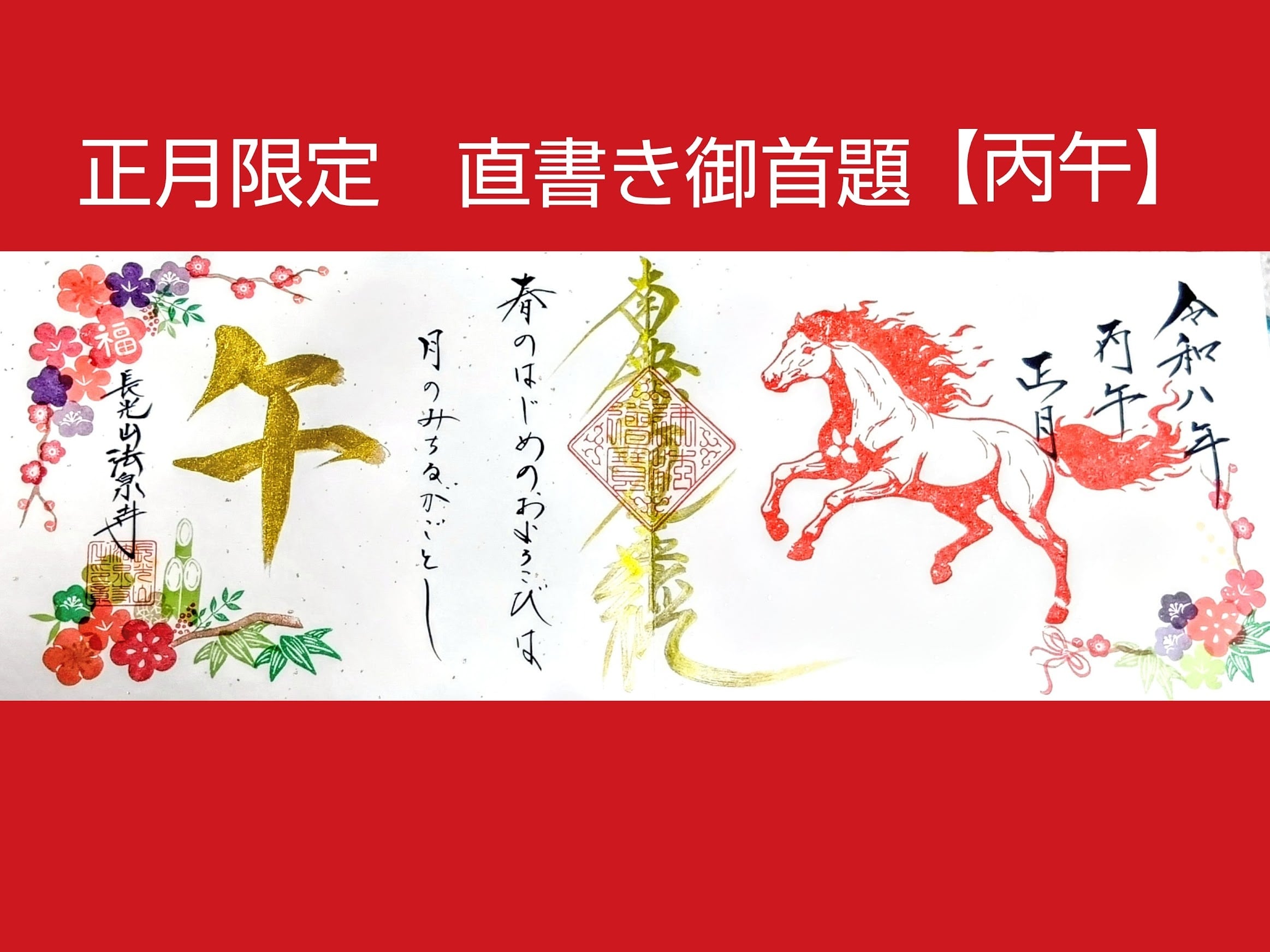 普通サイズの帳面の場合、4頁にわたります。馬のハンコのサイズが合わずしっぽが切れたり、折り目で馬の胴体に線が入り両断されてしまう可能性があります。ご了承のうえお申込みください。